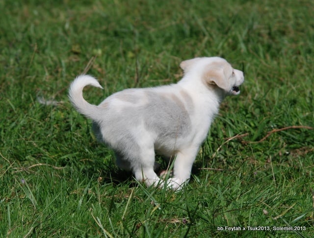 Il sera tout blanc avant son départ de l'élevage...son sous poil sera noir, comme celui de sa maman ou de Caryl... c'est signe d'une excellente pigmentation... Iannis est parti vivre en Normandie...chez Roxane